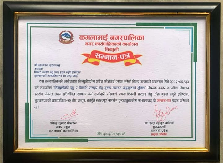 सिन्धुली । कमलामाई नगरपालिकाले सिकारी सरदार वंशु (वंश) गुरुङ स्मृति प्रतिष्ठानलाई सम्मान गरेको छ । २५८औं सिन्धुलीगढी विजयोत्सवको अवसरमा कात्तिक २४ गते आयोजित समारोहमा प्रतिष्ठानलाई सम्मान गरिएको हो ।